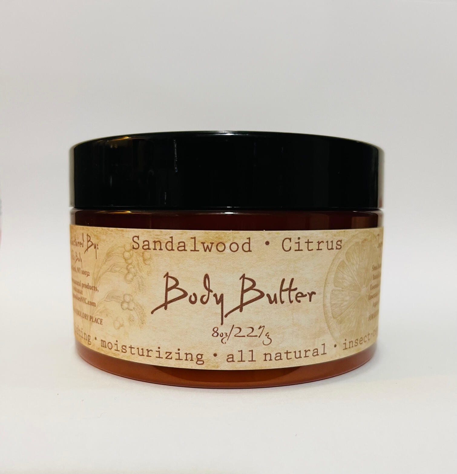 Ingredients: Shea Butter, Mango Seed Butter, Grapeseed Oil, Essential Oil of Sandalwood, Essential Oil of Lemongrass, Argan Oil, Vitamin E